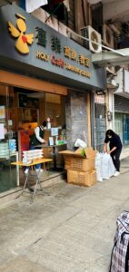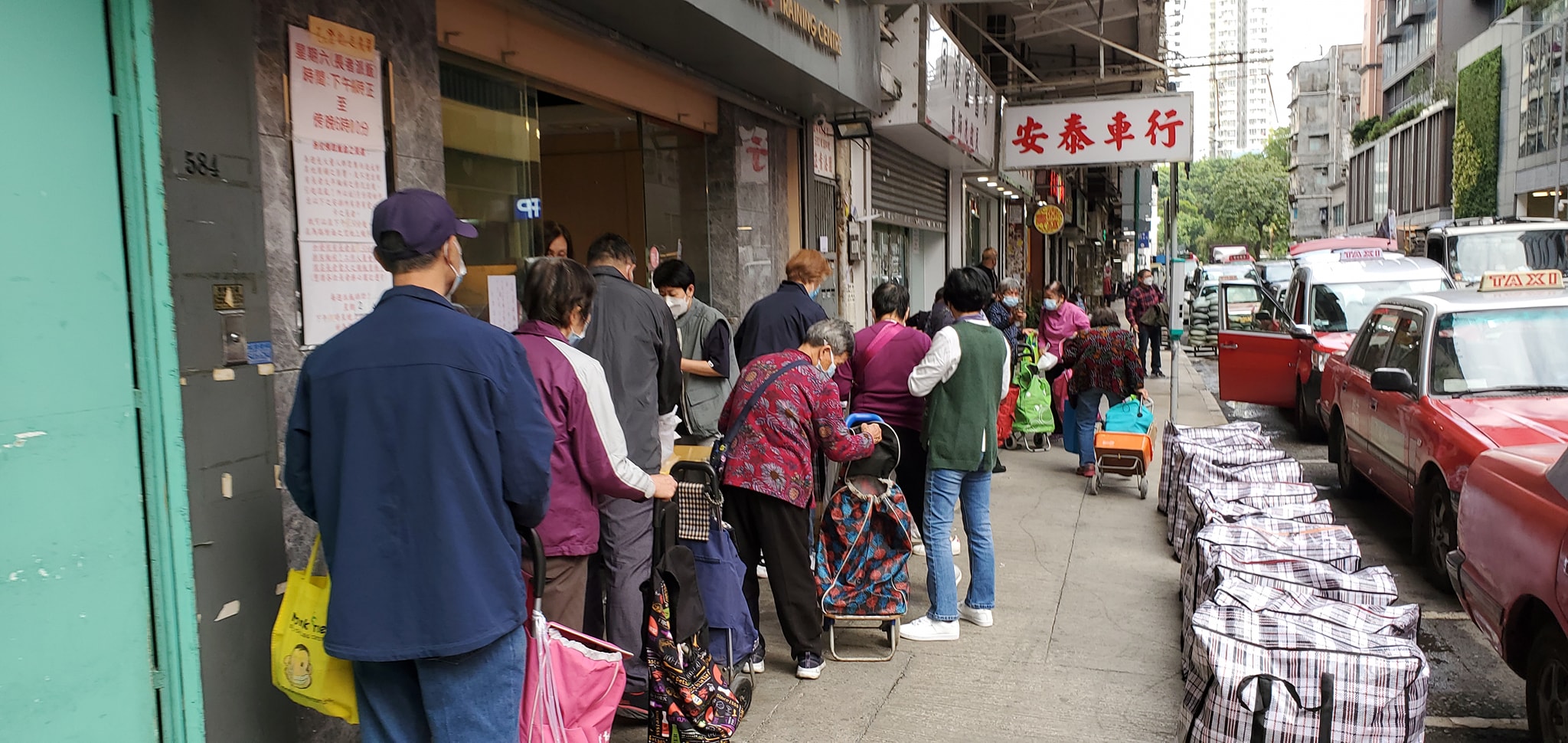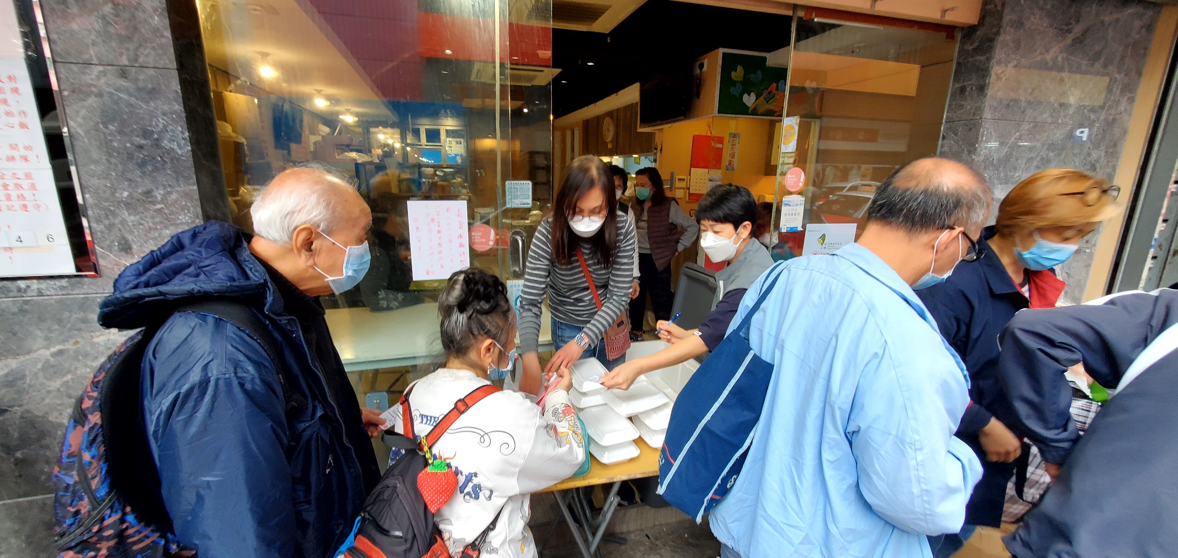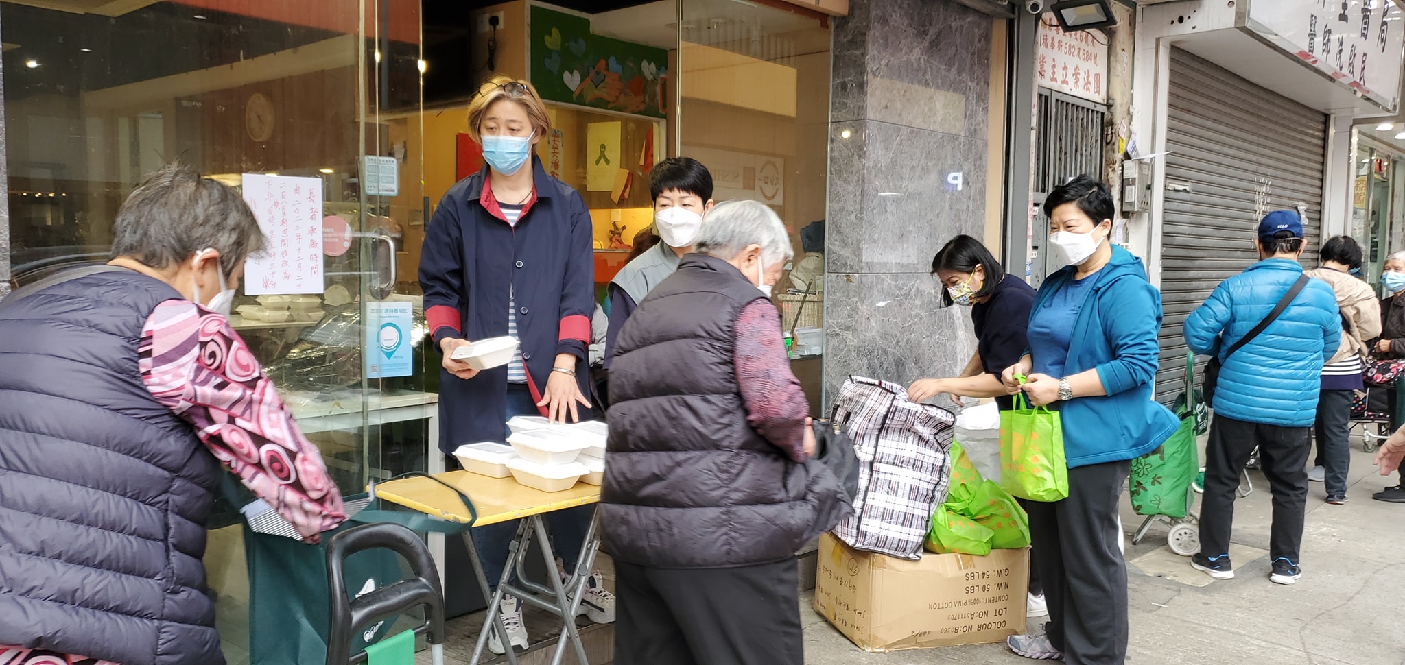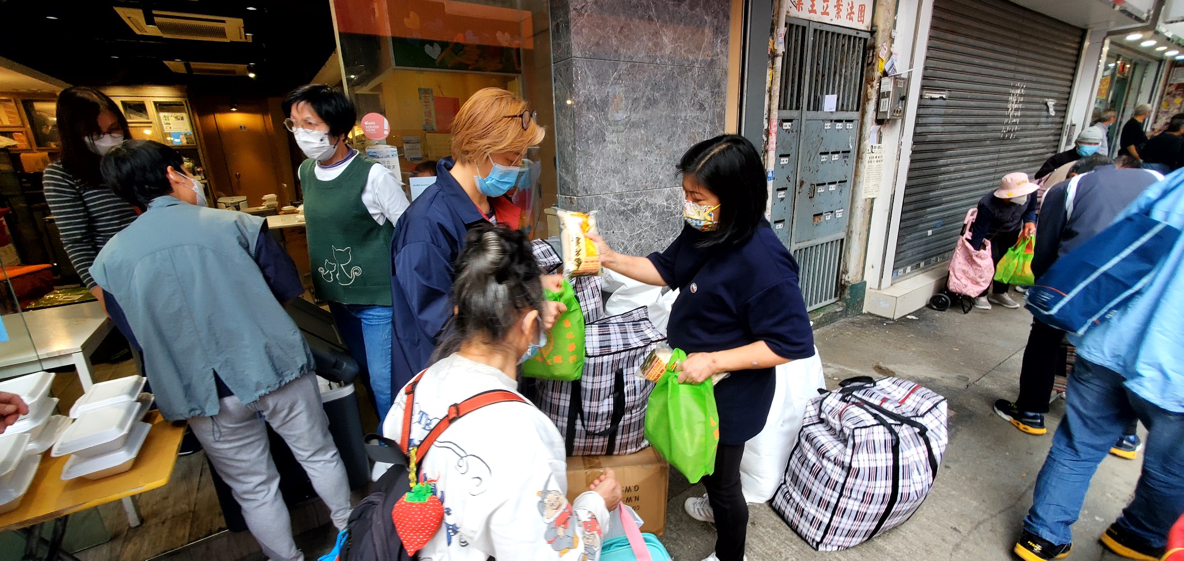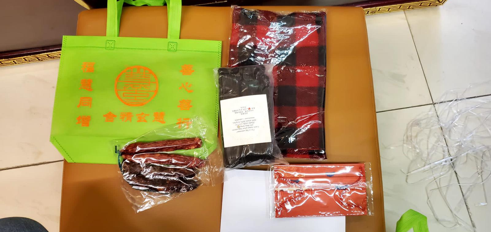 贈送物資給長者及有需要人士,包括:香米、口罩、頸巾、腿套及臘腸。